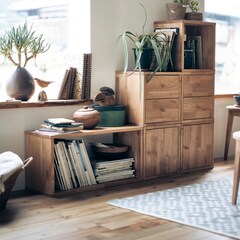 木製ボックスを組み合わせる、シンプルな収納システム。オープンボックスや棚板付きボックス、チェストがあり、組み合わせ次第で様々な用途に使用できます。